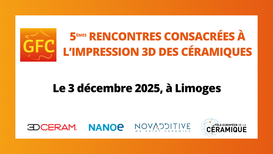 Les 5èmes rencontres consacrées à l’impression 3D des céramiques auront lieu à Limoges dans les locaux de 3DCERAM le 3 décembre 2025, jour de la fête internationale de l’impression 3D. Cette journée a pour vocation d’échanger sur les avancées scientifiques et technologiques de ces procédés céramiques. Elles sont organisées conjointement par le GFC, NANOE, 3DCERAM, NOVADDITIVE et le Pôle Européen de la Céramique.