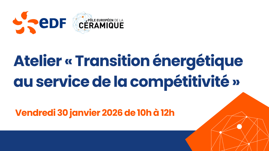 Dans le cadre du partenariat initié entre EDF et le Pôle Européen de la Céramique, un atelier « Transition énergétique au service de la compétitivité » est organisé le 30 janvier 2026 de 10h00 à 12h00 à Limoges, dans les locaux du pôle.