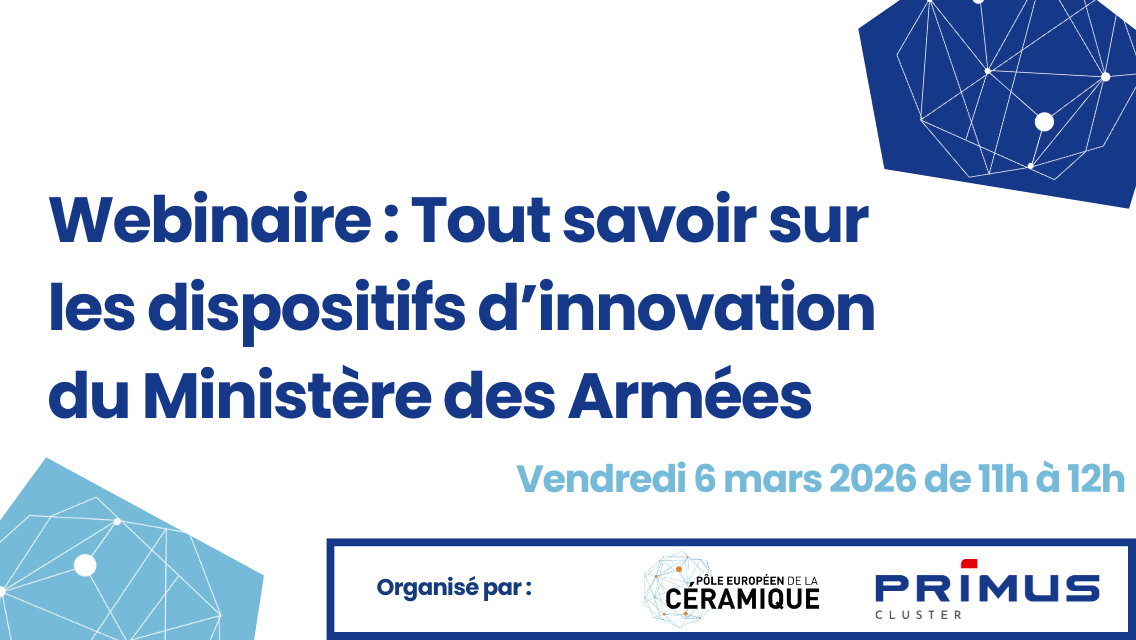 Le Pôle Européen de la Céramique, dans le cadre de sa collaboration avec l’Agence Innovation Défense (AID) et en partenariat avec le Cluster PRIMUS, vous invite à un webinaire dédié aux appels à projets du ministère des Armées le 6 mars 2026 de 11h à 12h.