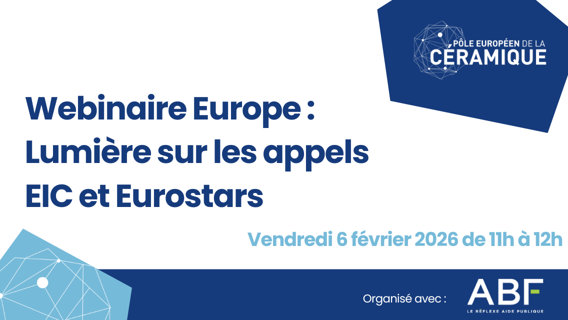 Le Pôle Européen de la Céramique organise, avec ABF Décisions, un Webinaire Europe dédié aux programmes de financements européens Eurostars et EIC (European Innovation Council), le 6 février 2026 de 11h à 12h.