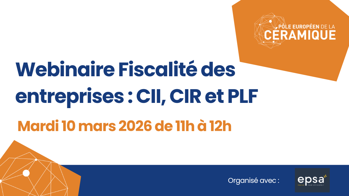 Le Pôle Européen de la Céramique en collaboration avec EPSA vous invite à un webinaire dédié à la fiscalité des entreprises. Nous présenterons le fonctionnement de deux aides fiscales majeures : le Crédit Impôt Recherche (CIR) et le Crédit Impôt Innovation (CII). Un focus sera également fait sur les modifications du projet de loi de finances (PLF) 2025, voire la présentation du PLF 2026 si l’actualité le permet.
