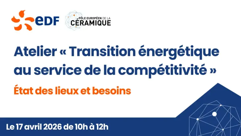 Dans le cadre du partenariat initié entre EDF et le Pôle Européen de la Céramique, un atelier « Transition énergétique au service de la compétitivité » est organisé le 30 janvier 2026 de 10h00 à 12h00 à Limoges, dans les locaux du pôle.